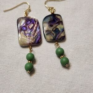 Colors - green, blue, purple rectangular beads, green accents, gold spacers