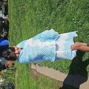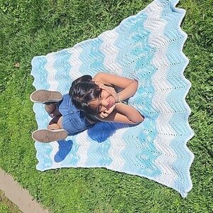 Hand Crafted Handmade Crochet Lacy Chevron Stitch Blue White Blanket Baby afghan