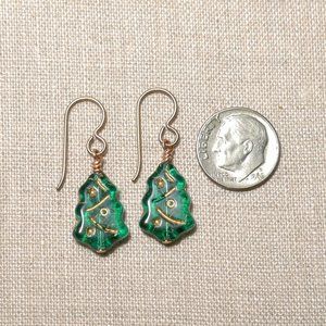 dangle earrings, dangling earrings, Christmas earrings, tree earrings, holiday earrings, winter earrings, green earrings, Czech glass earrings, festive earrings, handmade earrings, artisan earrings, lightweight earrings, hypoallergenic, anodized titanium ear wires, quality, gift, adornedbylily