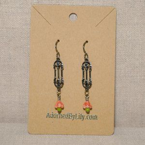 •Antiqued William Morris/Arts & Crafts style rosebud design solid brass stampings are accented with tiny coral pink Czech glass bell flower beads (bead color mimics angel coral)