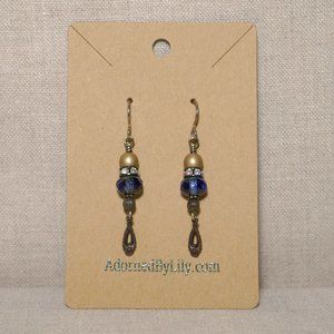 dangle earrings, dangling earrings, long earrings, brass earrings, blue earrings, cobalt earrings, Rhinestone earrings, sparkly earrings, feminine earrings, vintage style earrings, Victorian style earrings, lightweight earrings, hypoallergenic, anodized titanium ear wires, quality, gift