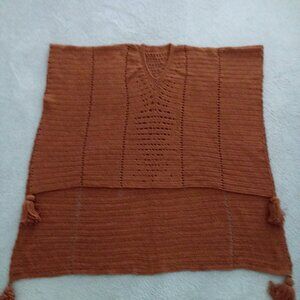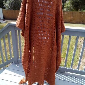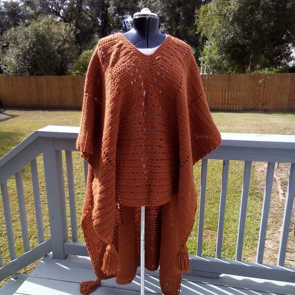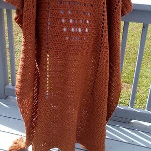 Hand Crafted Hi-Low Crochet Poncho, Size one-size, Color burned orange,. Made with 100% Acrylic yarn.