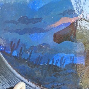 This terra cotta plate has been hand painted with a beautiful wild black stallion alone in the desert. It's a cloudy night but behind those clouds is a bright white moon encircled by stars. He's standing guard over his mares, they're not too far away so he can easily run to them and protect them from danger. He's in the high desert, in the distance are several saguaro (swaro) cacti that stand like guards in the moonlight.