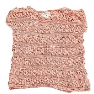 This is a super cute summer top or swim coverup. It has bobble stitches all throughout the front and back and very short sleeves which could make it could be used as knit vests or an adorable swim coverup. It’s slightly see through so definitely a shirt underneath would be needed unless wearing for a swimsuit coverup. The material is a soft light pink cotton and is such a soft baby pink color.
