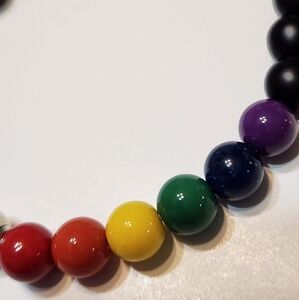 Add a pop of color to your outfit with this vibrant beaded bracelet. Featuring a mix of black, red, orange, yellow, green, blue, and purple beads, this accessory is perfect for any occasion, especially Pride Month celebrations.