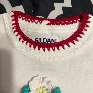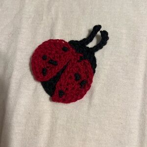 The white cotton T-Shirt was embellished with hand made crochet lady bugs and a white and green flower.