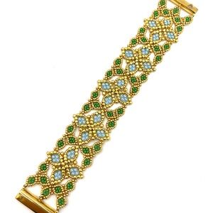 Stunning handmade beaded bracelet with gold, green and sky blue seed beads woven into this intricate leafy lace pattern. With green and blue leaves. Finished with a gold plated bar magnet clasp that is interlocking for extra stability. This piece is 8” long and about 1 1/2” wide. Statement Elegant Party Plus size Festival Hippie Boho Hand made Hand Crafted Spring Summer Vacation Handcrafted by me so each piece is one of a kind. Your order is beautifully packaged with care and shipped the same or next business day.