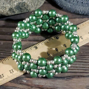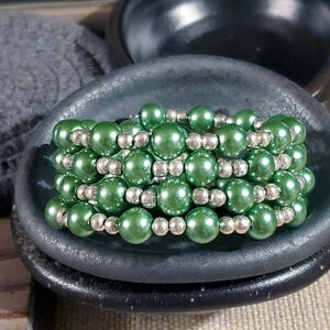 Hand Crafted Medium Green Glass Pearl Silver Beads Wrap Bracelet