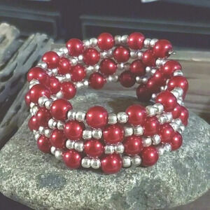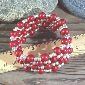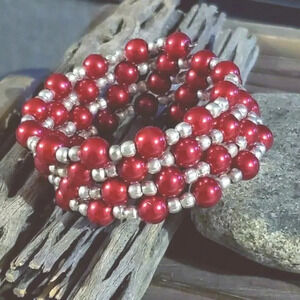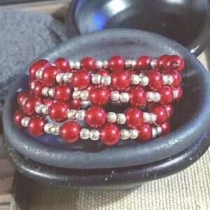Hand Crafted Medium Red Glass Pearl Silver Beads Wrap Bracelet