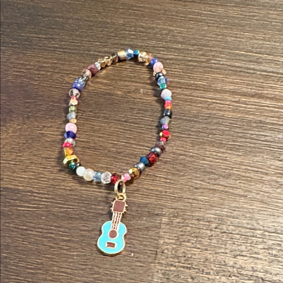 Vibrant beaded bracelet. Features a charming guitar pendant. Perfect for kids.
