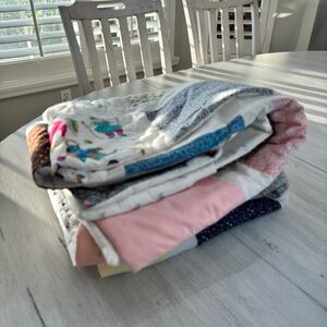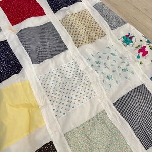 Hand Crafted Multicolor Patchwork Quilt Throw White Contrast Fabric 56” X 62”. Good pre-owned condition. Faint stain on one area. See photos. No holes or snags. All measurements are approximate.