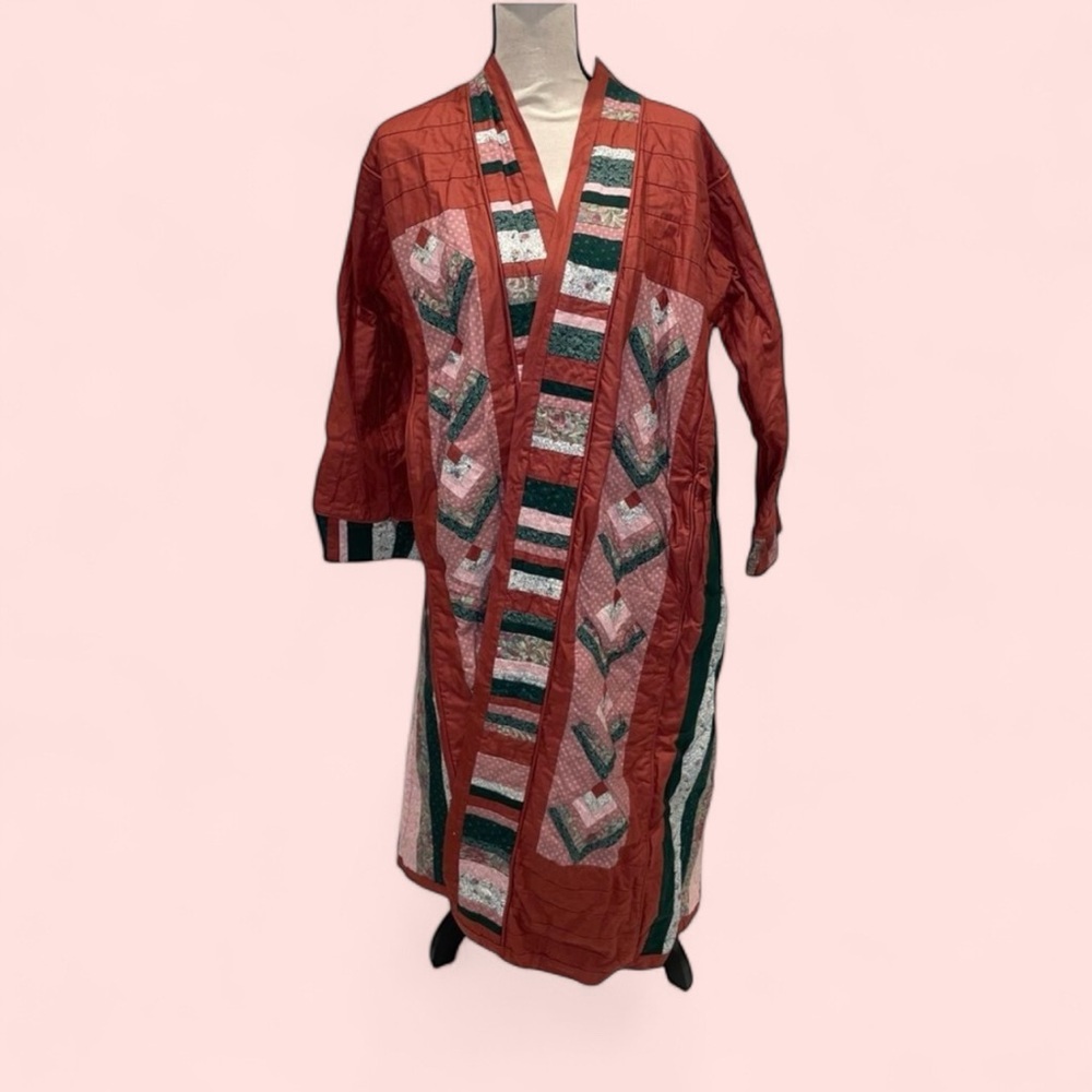 Unique quilted robe with geometric patterns. Features a blend of earthy tones. Comfortable and stylish for lounging.