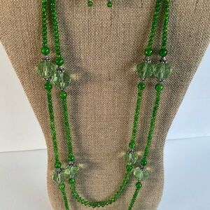 Hand Crafted Necklace Wrap Bracelet Drop Earrings Set Lime Green Double Strands