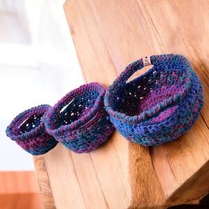 Add cozy, handmade charm to your home with this set of hand-crocheted nesting baskets. Made with richly textured yarn in vibrant blue, teal, and purple tones, these baskets are both decorative and practical.