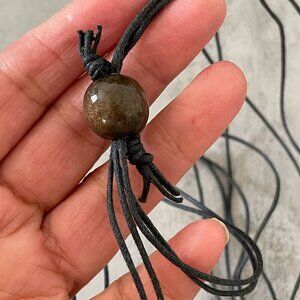 Owl on a branch appears to be hand painted but could be a lacquered transfer set below a red glass element suspended on greyish-black cord. Cord is adjustable with pull through bead closure.