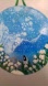 This 12" vinyl record has been upcycled into a piece of wall art. The background of white, blue, light magenta, and green was created with a fluid art method and