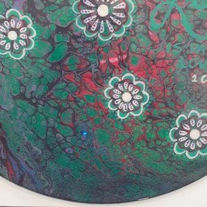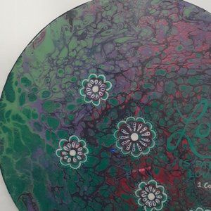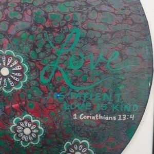 HP 4/9/25 "Love Is Patient, Love Is Kind". This repurposed 12" vinyl record has been created by our three step process. First, the background is created with a fluid art technique. Then the 2nd addition hand painted on top. The third addition is two coats of resin to give it a high gloss and make all the metallic colors more vibrant. Sage green, purple, magenta and white makes a colorful background.. Clear coat high-glass epoxy resin brings artwork to life while protecting it. It adds both depth & dimension. Although the results glisten for themselves, the process requires patience, preparation, and care, but the ending results are so worth it! We do our best to insure perfect coats of resin but occasionally, as with any creative process, there may be tiny imperfections, i.e. bubbles.