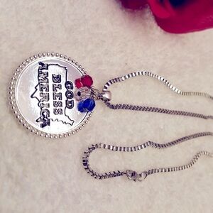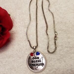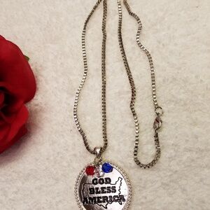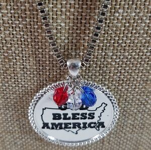 This is a Handcrafted chain Pendant Necklace with a beaded charm. The pendant is engraved with the phrase “God Bless America.”
