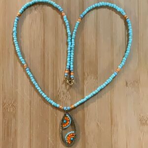 Hand Crafted Pendant Necklace Seed Beads Turquoise Orange Gold tone findings