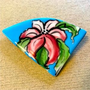 Hand painted blue ceramic pin with a pink flower. Artist signature on back. Unique shape, measures approximately 2.75” by 2”. Excellent pre-owned condition.