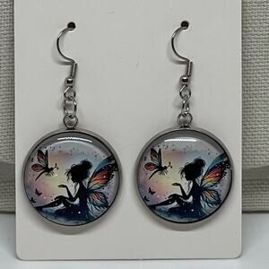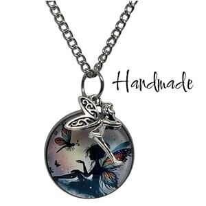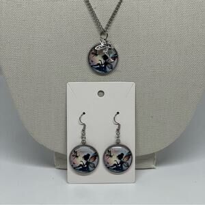 Handmade Pink Blue Yellow Silver Fairy Whimsical Pendant Necklace & Earrings Set NWT OS