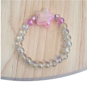 Hand Crafted Pink Star Beaded Bracelet Irridescent Glass Acrylic Stretch Size 7"