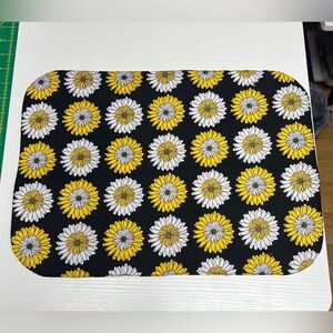 Cute machine embroidered cotton placements featuring yellow and brown sunflower on white background, bordered on side and back with black background and white and yellow daisies. Great for everyday dining!