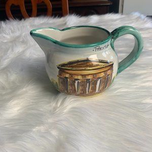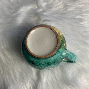 Hand Crafted Pottery Pitcher Green Yellow Floral Design and Structured Building
