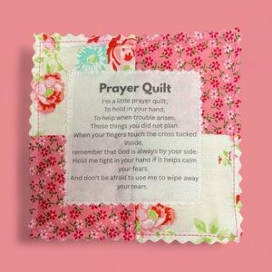 Each prayer quilt is lovingly hand made and includes an uplifting prayer along with tucked inside a small wooden cross, bringing peace, encouragement, and a reminder of God’s presence.