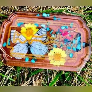 Handmade 4” Razor blade design of a tidbit dish to catch any loose earring backs or change.Gold in color and littered with genuine flowers and accents this is a very original piece that can be used on a table or displayed on a wall