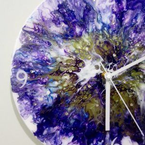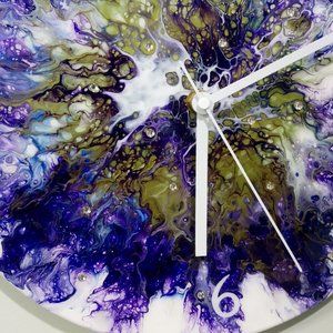 12" round vinyl is hand painted with a fluid art technique. White numbers are hand painted and extra rhinestone bling is added to this one! Beautiful splashes of purple on a white background with shimmering metallic olive green in the center.