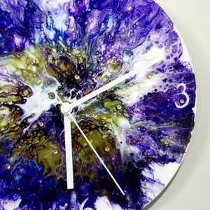 Hand Crafted Resin Clock Fluid Art Bling Purple Olive Green Rhinestones