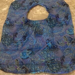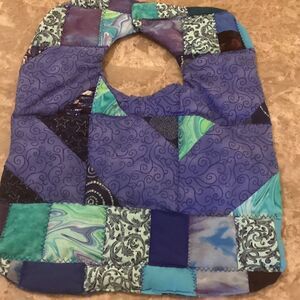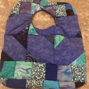 NWOT. Hand crafted from all new 100% cotton fabrics in a smoke free home. 2 bibs in one with this reversible bib - one side features patch work blues and greens while the other is a coordinating blue print. All quilted and Velcro fastener