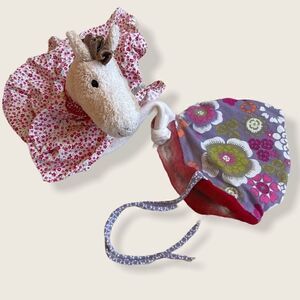 This gorgeous little cap is made from the softest, warm boiled merino wool on one side and an equally soft cotton floral fabric on the reverse and the ties. It is in like new condition and will keep your baby super warm and cute in winter! Let me know if you have any questions.