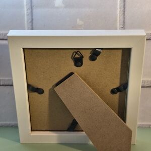 Comes with wooden frame. Can either be set on a shelf or hung on a wall.