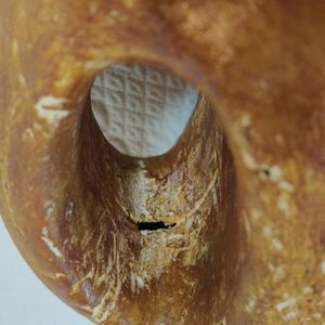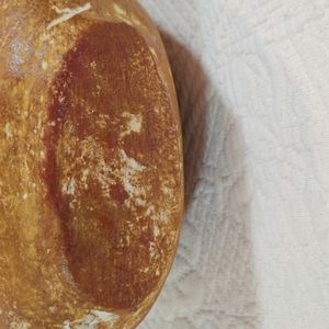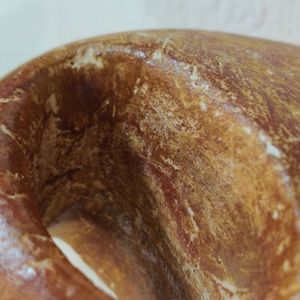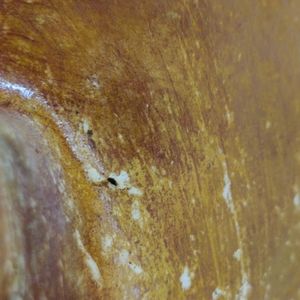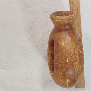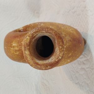 seems to have been used a lot at some time, don't know where it is from or when it was created. there are areas worn away, corrosion of seam where forming two pieces, see photos. Great rustic pottery piece for display. looks like there is a artist signature but not sure, could not make out what was there, see last pictures. If nothing else it is a beautiful piece for display.