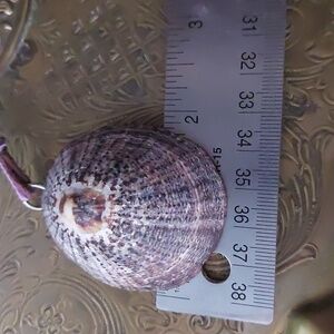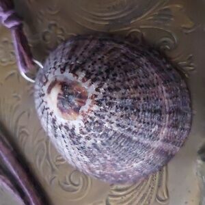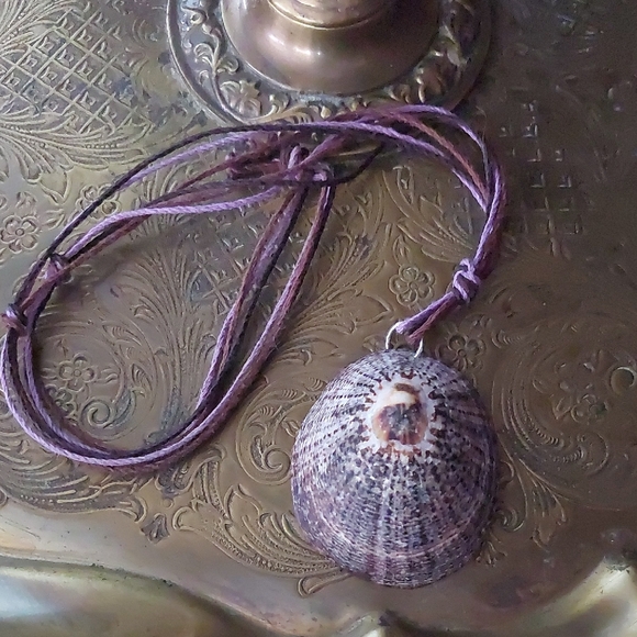 Handmade sea shell necklace in brown and cream tones with purple. The shell pendant hangs on a knotted hemp cord that hangs 12.75" long and is designed to slip over the head. Shell measurements are in the photos.