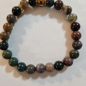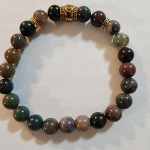 This is a handcrafted gemstone stretch bracelet. The beads are 10mm natural stones, 8mm antique gold spacers, and 8mm focal bead engraved with the word "LOVE."