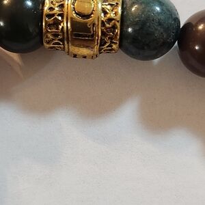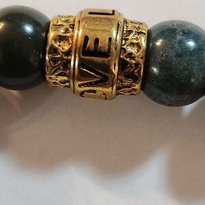 Hand Crafted Stretch Bracelet Gemstone with LOVE Bead Green Brown Antique Gold