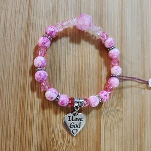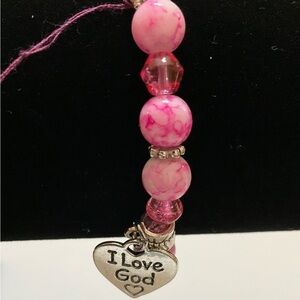 Hand Crafted Stretch Bracelet Pink Beads Silver I Love God Charm