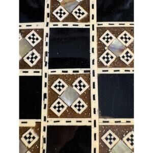 Very good preowned condition. Chest set, possibly made in Egypt consists of quartz and mother pearl in laid squares and quartz hand carved pieces. A few squares have marks on them, but otherwise this is a beautiful set. The board is trimmed in wood and sit in a wood base. Each piece is it easily identifiable. The pieces fit nicely and elasticized loops on the top of the case and the board fits nicely in the bottom. The case is lined in velvet. There is a gold tone clasp closure. Board measures approximately 8 in.² and each piece varies in size but are approximately one and a half inches tall this is a great set to have open in your living area for anyone to sit down and make a move. Or give it to your favorite chess aficionado.