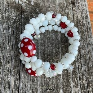 This is a glamorous handmade wrap coil bracelet. It is made with two polka dot red and white focal beads, white faceted beads, red faceted beads, clear crystal clusters and silver daisy wheels.