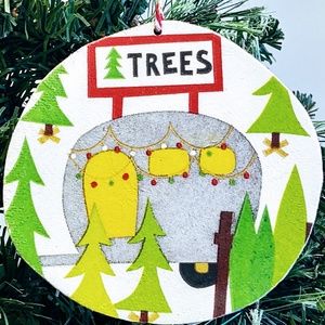 Hand Crafted Wood Christmas Ornament Decoupage Vintage Camper/Christmas Tree Lot