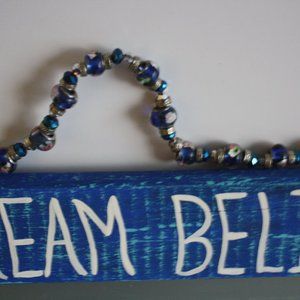 Hand crafted wood hanging with the words, "Hope Dream Believe". Painted in blue & turquoise with words in white. A stone blue butterfly is attached to the right side. The hanger is beaded. Approximate measurements: