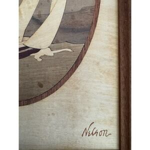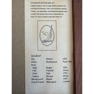 Good preowned condition this wooden marquetry wall hanging by Nelson is made on teak wood. This particular piece did have something splash on it. Seller believes that teak oil would be able to get rid of the spots that are seen, please note on photos included. The scenes of two figures on a sailboat at sea with two seagulls overhead. This wall hanging depict a Hudson river scene. Different types of wood have been used, including walnut, Myrtle wood, maple, patrol. Oak, wenge, and mahogany. The different wood originates from the United States, Central America, and Africa.
