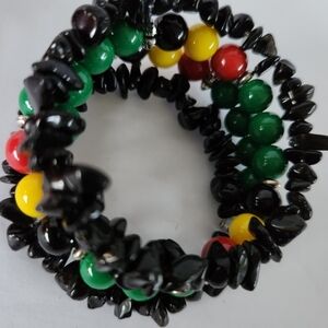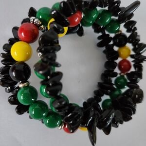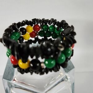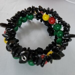 This is a Hand Crafted memory wire bracelet symbolic of the African American flag. The colors of this handcrafted beaded bracelet are black, green, yellow, and red. They are glass beads and chips.