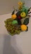 Fruit included one yellow pear, one yellow lemon with green leaves, one green apple, one cluster of green grapes, one purple grapes, one red and yellow apple, and one mini- pear green decorative green and gold deco mesh ribbon with artificial leaves, yellow flowers and red mini-berries.