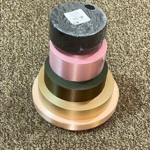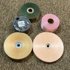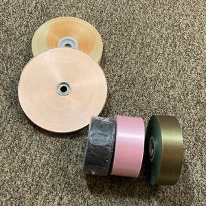 Set of assorted colored ribbons. Includes pink, green, and cream shades. Perfect for crafts and decoration