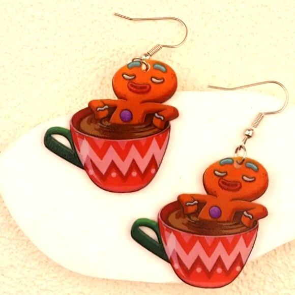 Hand Crafted Charming Gingerbread for Man Coffee Cup Dangle Earrings - Cute Cartoon Acrylic, Nickel-Free Alloy Hooks - Perfect Christmas & Party Accessory for Women