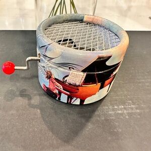 Charming music box featuring a vibrant design. Includes a red handle for winding.